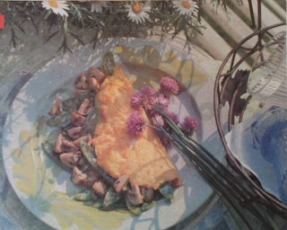 6. Cuando la superficie de la omelette esté húmeda a su gusto (o sea al mío...) enróllela y sirva; o márquela por la mitad, distribuya sobre una mitad el relleno elegido, dóblela y déjela unos instantes sobre el fuego más suave, para que el relleno se caliente. Deslice en fuente precalentada y sirva.